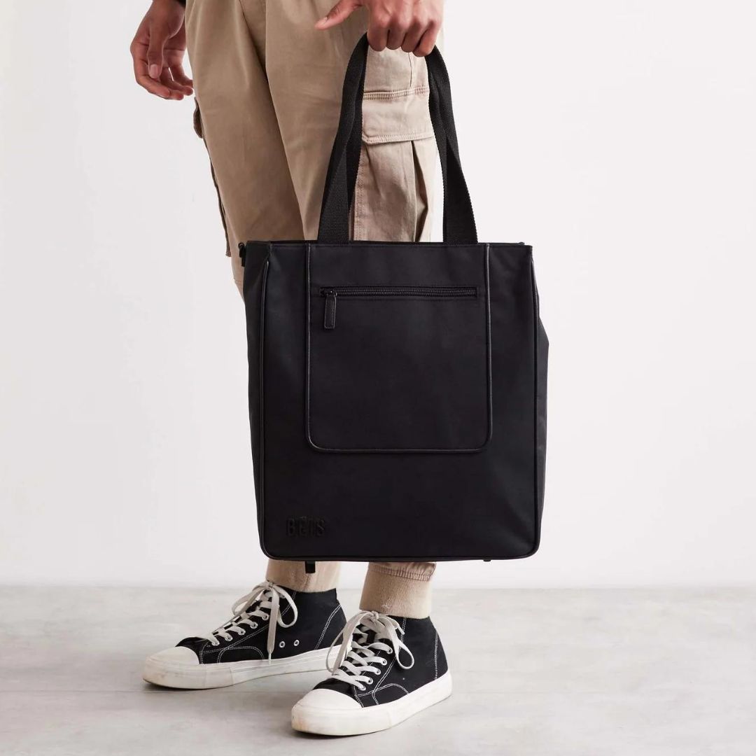 A classic north-south style crafted from recycled materials. This travel tote bag is packed with functional pockets so you always know where your phone, keys, and wallet are.