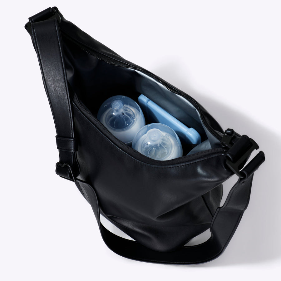 The bag designed for thirsty babies, stylish parents—and anyone who likes their drinks cold and their bag hot. Inside, the insulated, wipeable lining handles spills without drama and fits up to six wide baby bottles… (or five and one "special formula" bottle for mom). Chic enough to carry on its own, smart enough to live inside a bigger bag, and stylish enough to keep using long after bottles aren't the main event. Clip it to your stroller, throw it over your shoulder for daycare pickup, or bring it to dinner because it genuinely looks that good.