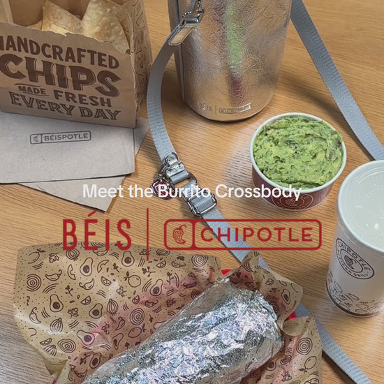 A compact silver crossbody designed for hands-free carry—and yes, it fits a full Chipotle burrito. Complete with a co-branded burrito-shaped zipper puller and a removable chili pepper charm for a little extra flair, this bag proves that function can be deliciously fun. The insulated interior keeps your burrito (or other essentials) perfectly warm while you dash from city streets to airport terminals. Effortless style, packed and ready to go—for real.
