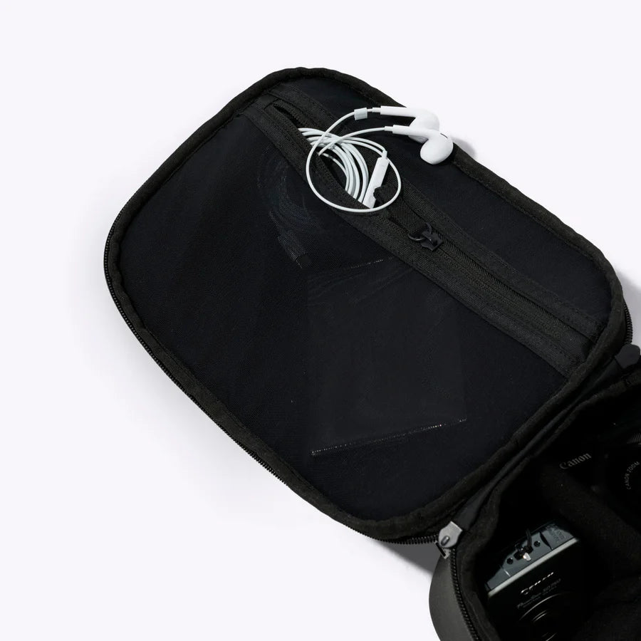 - Interior elastic mesh pocket for smaller essentials like lens caps, batteries, and memory cards