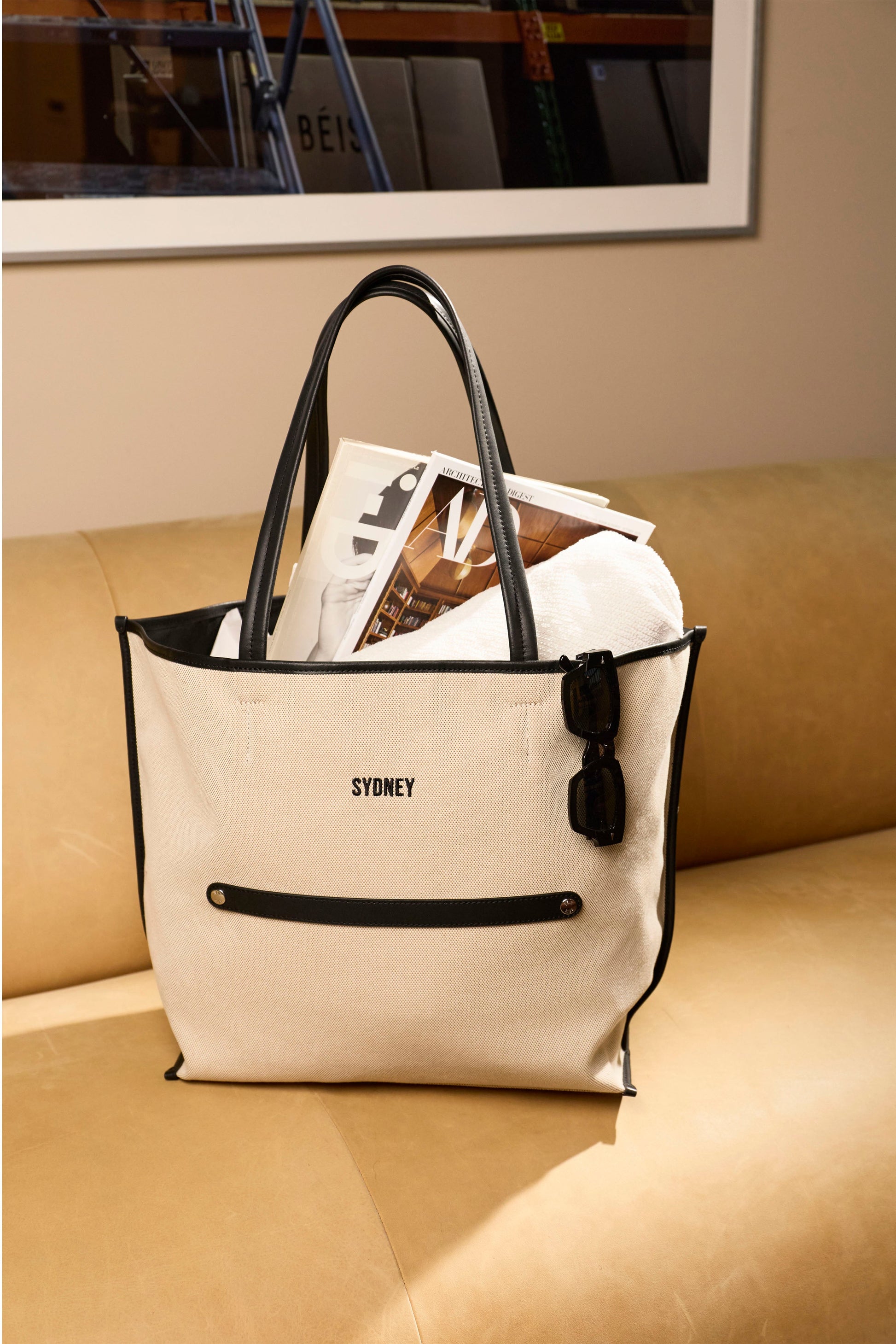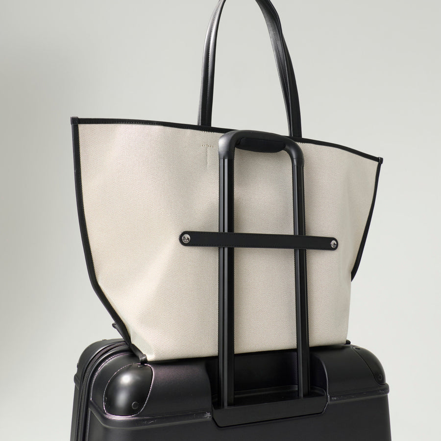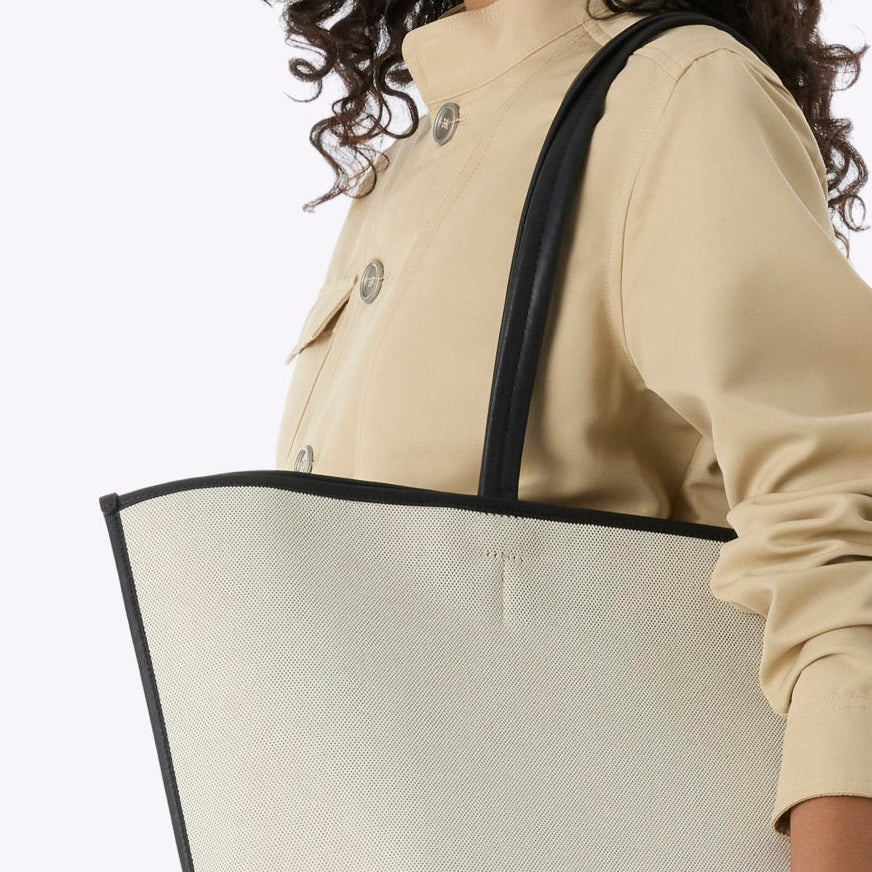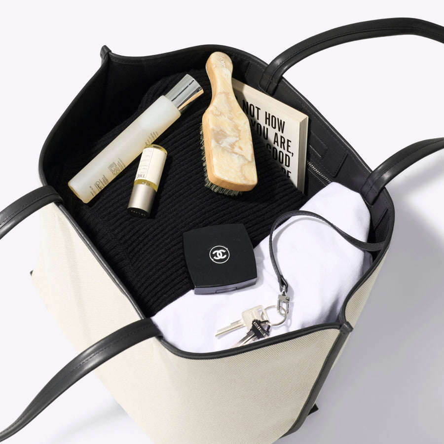 The Canvas and Leather Tote is built on a coated canvas body with genuine leather trim—clean lines, minimal fuss, and the kind of understated polish that works as hard at the airport as it does anywhere else. It’s the bag you reach for when you want one thing to pull the whole outfit together without trying too hard.