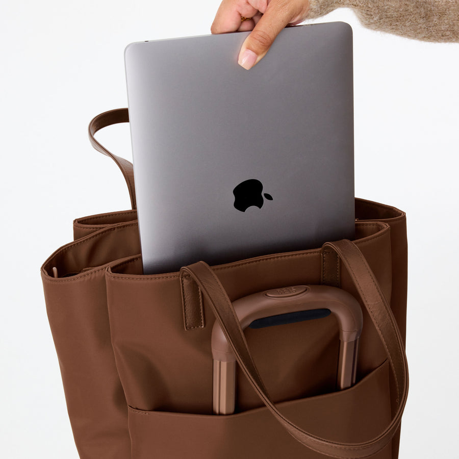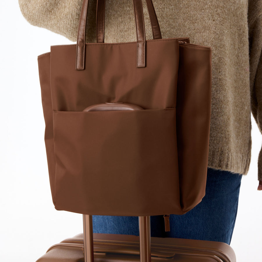 Made with our new, sleek nylon and classic vegan leather, this is the perfect everyday tote for your commute and beyond. It combines travel-focused details like metal feet and a trolley pass-through with versatile features (we love being able to adjust and remove the additional strap), and — of course — a key leash. Slip your phone in the hidden cell pocket, snap close the magnetic compartments for extra security, and queue your commute playlist. A tote that combines minimal style with maximum function? All aboard.
