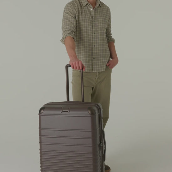 The built-in weight indicator signals when you hit 50 lbs—because surprise fees at check-in are nobody’s idea of a good time. Sized between our Medium and Large Check-In, it’s the in-between that somehow fits everything.