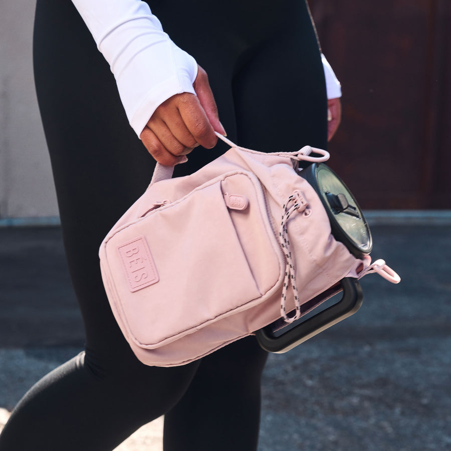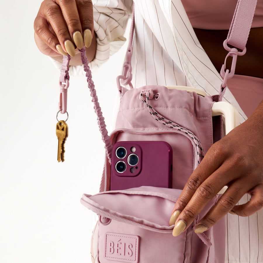 Dress up your favorite water bottle with this innovative, stylish sling, perfect for the gym, walks, or hikes. A front zip pocket keeps your phone handy, and the side opening gives easy access to smaller items—like those earbuds you can’t go without. Featuring a built-in magnet designed to attach to compatible metal gym equipment, you'll never sweat misplacing your items. With room for gym gear, cards, chapstick, and keys, it’s the hands-free way to stay organized… and hydrated, obviously.