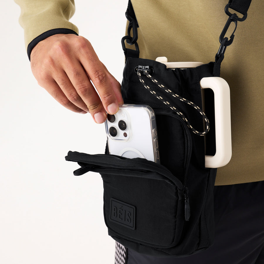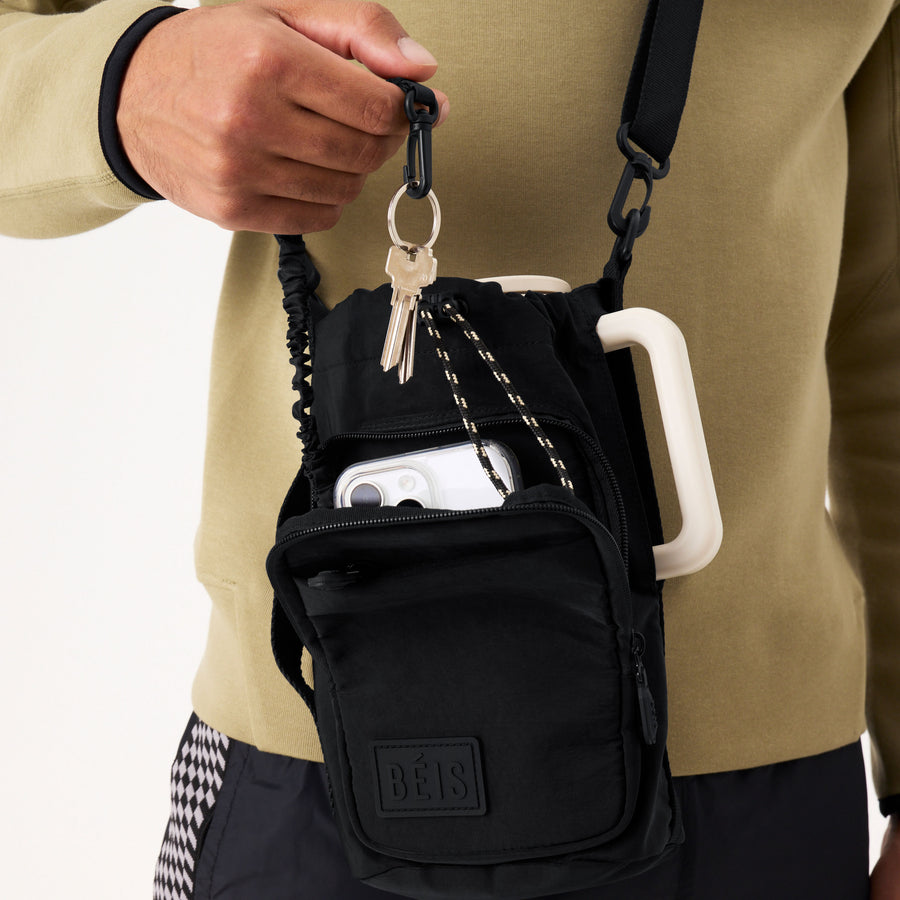 Dress up your favorite water bottle with this innovative, stylish sling, perfect for the gym, walks, or hikes. A front zip pocket keeps your phone handy, and the side opening gives easy access to smaller items—like those earbuds you can’t go without. Featuring a built-in magnet designed to attach to compatible metal gym equipment, you'll never sweat misplacing your items. With room for gym gear, cards, chapstick, and keys, it’s the hands-free way to stay organized… and hydrated, obviously.
