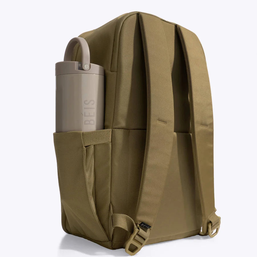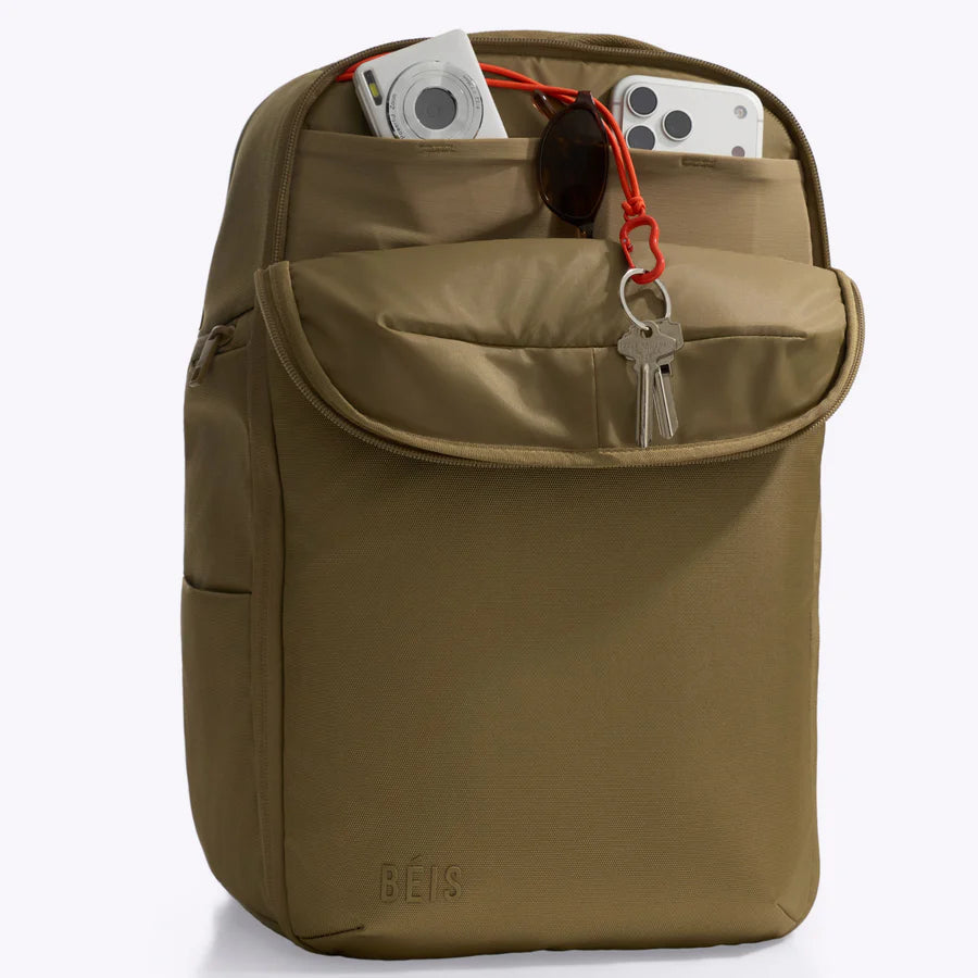 - Smart exterior access including a felt-lined top pocket, expandable water bottle pocket, and side charging pass-through